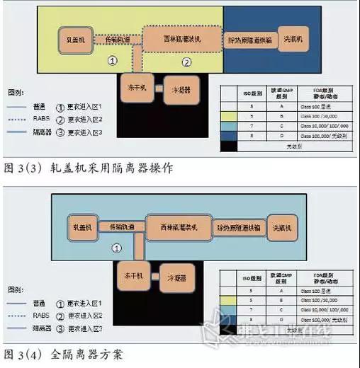 在這個(gè)方案中,對(duì)從除洗瓶機(jī)之外整條灌裝生產(chǎn)線采用隔離操作器。整個(gè)背景至少保持D級(jí)環(huán)境,見(jiàn)圖3(4)。隔離操作器的采用,本身也更適用于前述的激素類、高致敏性、毒性類的產(chǎn)品,由于隔離器的隔離保護(hù)較RABS更徹底,因此對(duì)高附加值、高質(zhì)量要求的產(chǎn)品來(lái)說(shuō)也是較好的選擇。