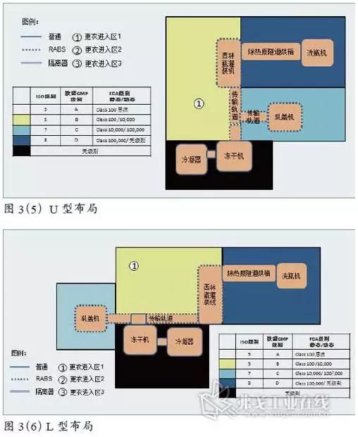 直線型灌裝線,采用O-RABS,核心受控區(qū)為B+A,這是今后若干年內(nèi)無(wú)菌小容量注射劑生產(chǎn)最多可能采用的方式,所以這里稱之為基本布局,見(jiàn)圖3(1)。灌裝生產(chǎn)線、輸送軌道和凍干機(jī)進(jìn)出料均在B級(jí)區(qū),洗瓶和除熱原隧道烘箱在D級(jí)區(qū),軋蓋設(shè)置在C級(jí)區(qū)。凍干機(jī)則在無(wú)級(jí)別區(qū)。