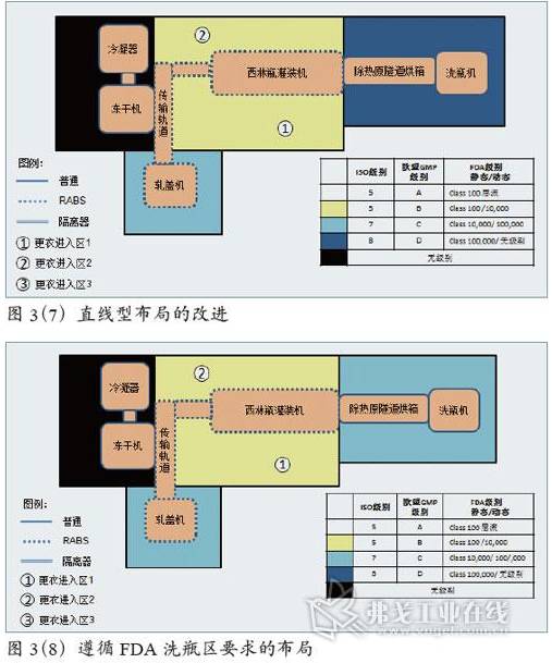 由于所有設(shè)施均在一個(gè)房間,在生產(chǎn)方面具有很好的聯(lián)通性。通過(guò)對(duì)環(huán)境要求的降低,也節(jié)約了能耗和運(yùn)行成本。在環(huán)境控制和相互影響方面,例如除熱原隧道烘箱帶來(lái)熱量的發(fā)散、從房間抽取空氣帶來(lái)的新風(fēng)補(bǔ)充問(wèn)題,以及洗瓶機(jī)帶來(lái)的濕度控制問(wèn)題等,需在設(shè)計(jì)中妥善考慮,但不在本文的討論范圍。